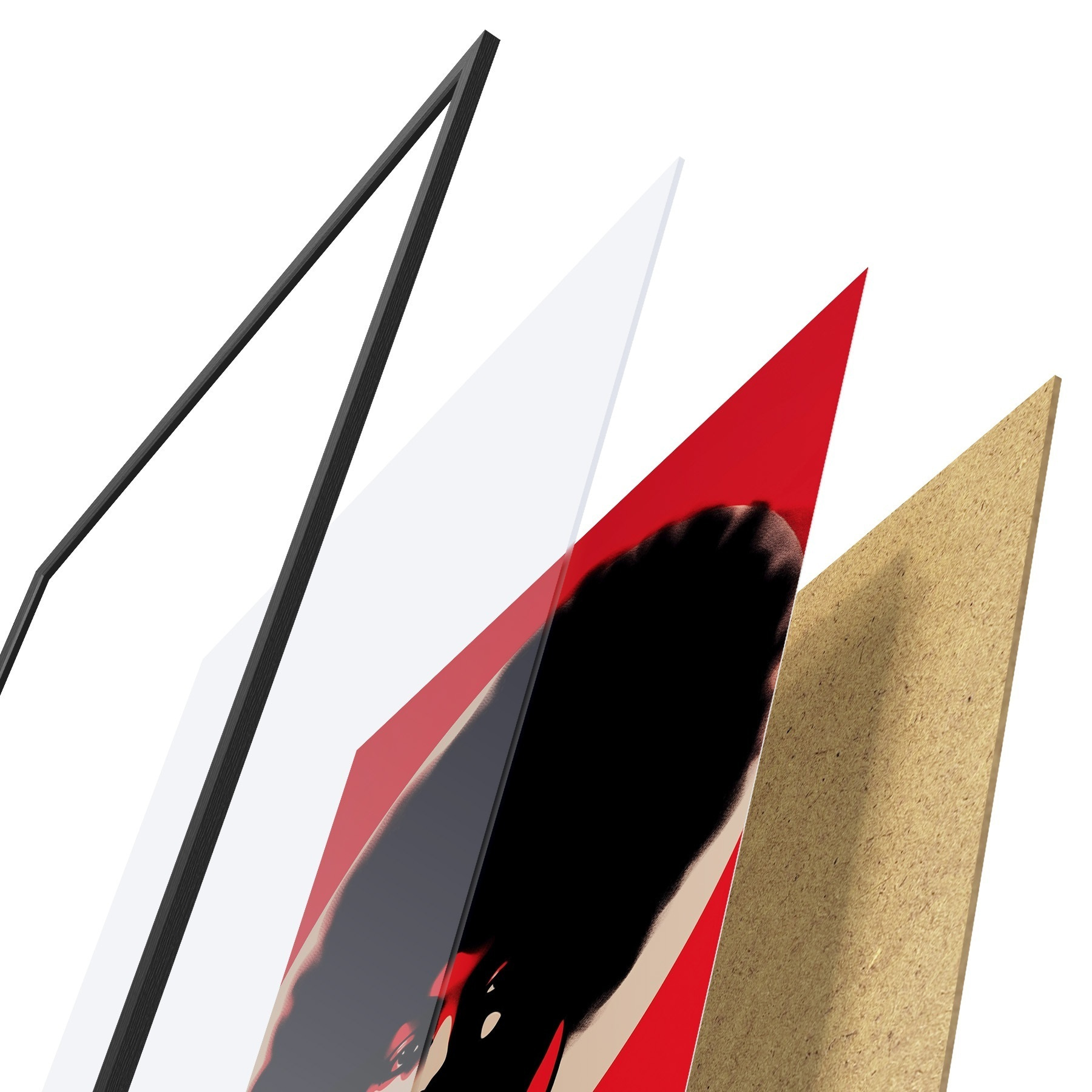 Plakat składa się z ramy, pleksi, wydrukowanego obrazu i podkładu z płyty wiórowej. Plakat można natychmiast zawiesić na ścianie dzięki uchwytom z tyłu.