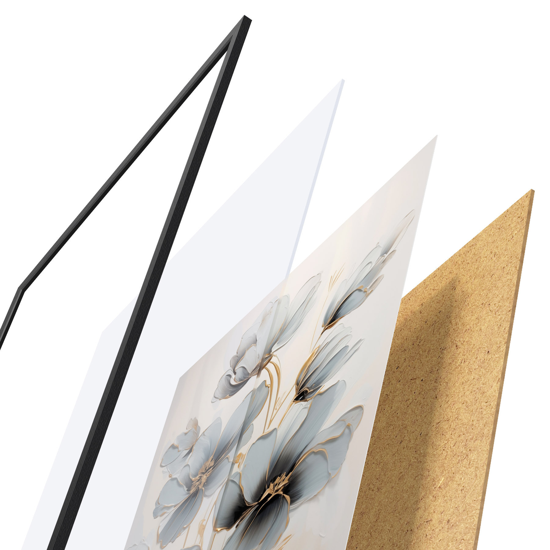 Plakat składa się z ramy, pleksi, wydrukowanego obrazu i podkładu z płyty wiórowej. Plakat można natychmiast zawiesić na ścianie dzięki uchwytom z tyłu.