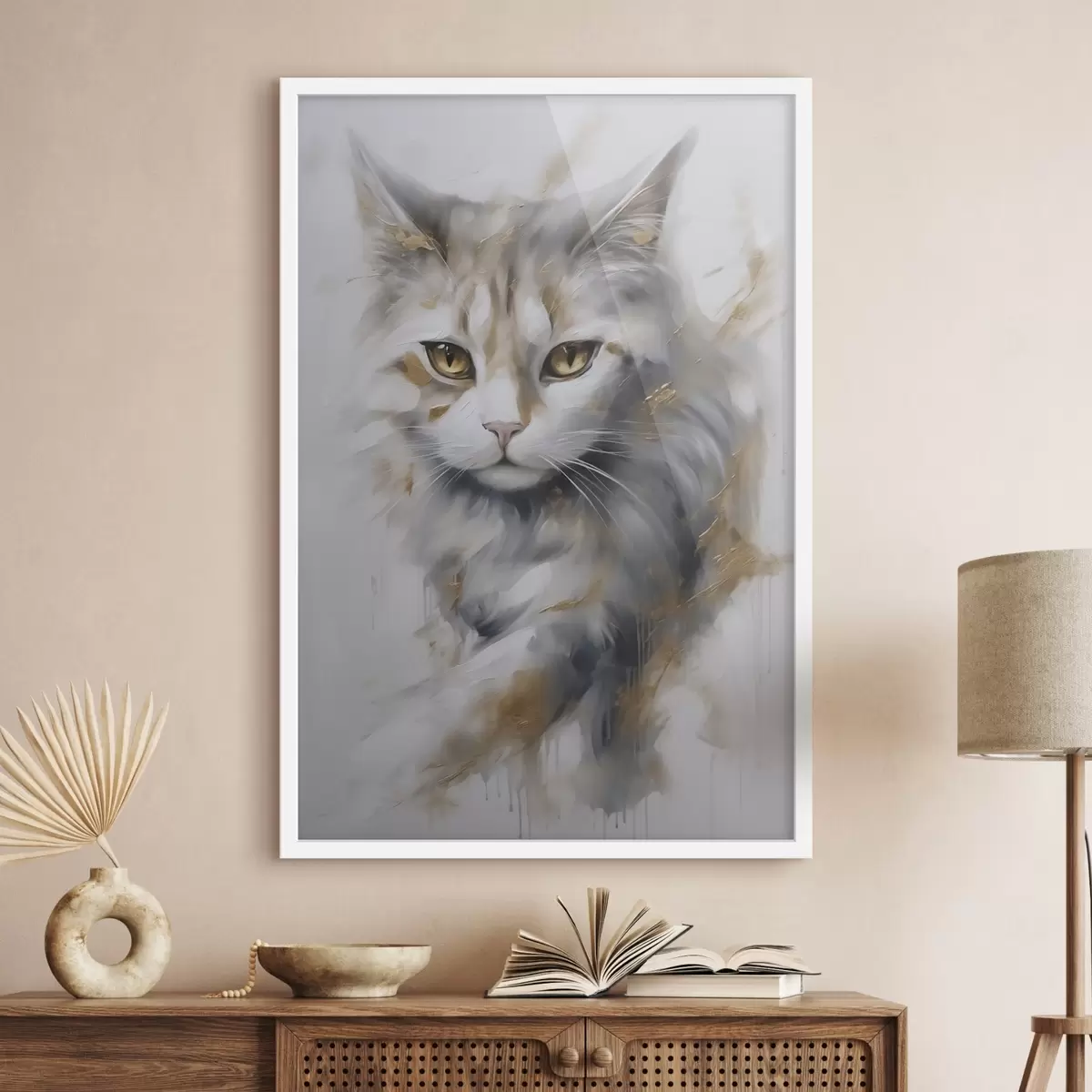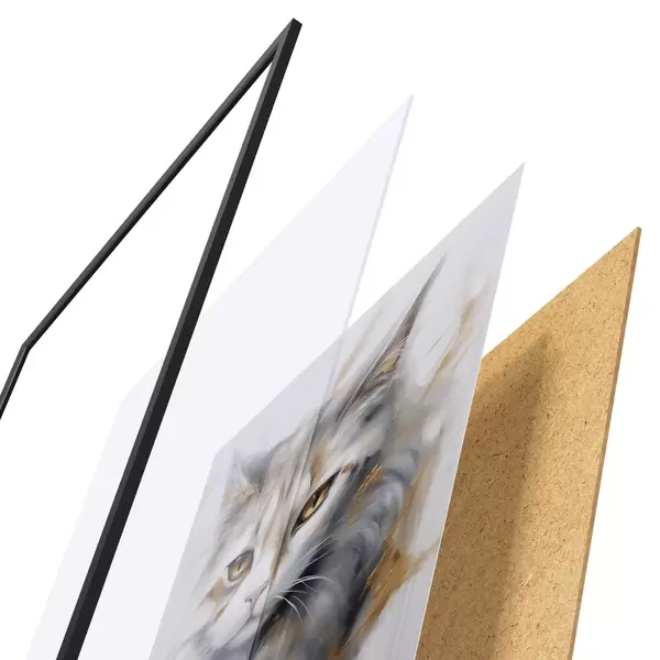 Plakat składa się z ramy, pleksi, wydrukowanego obrazu i podkładu z płyty wiórowej. Plakat można natychmiast zawiesić na ścianie dzięki uchwytom z tyłu.
