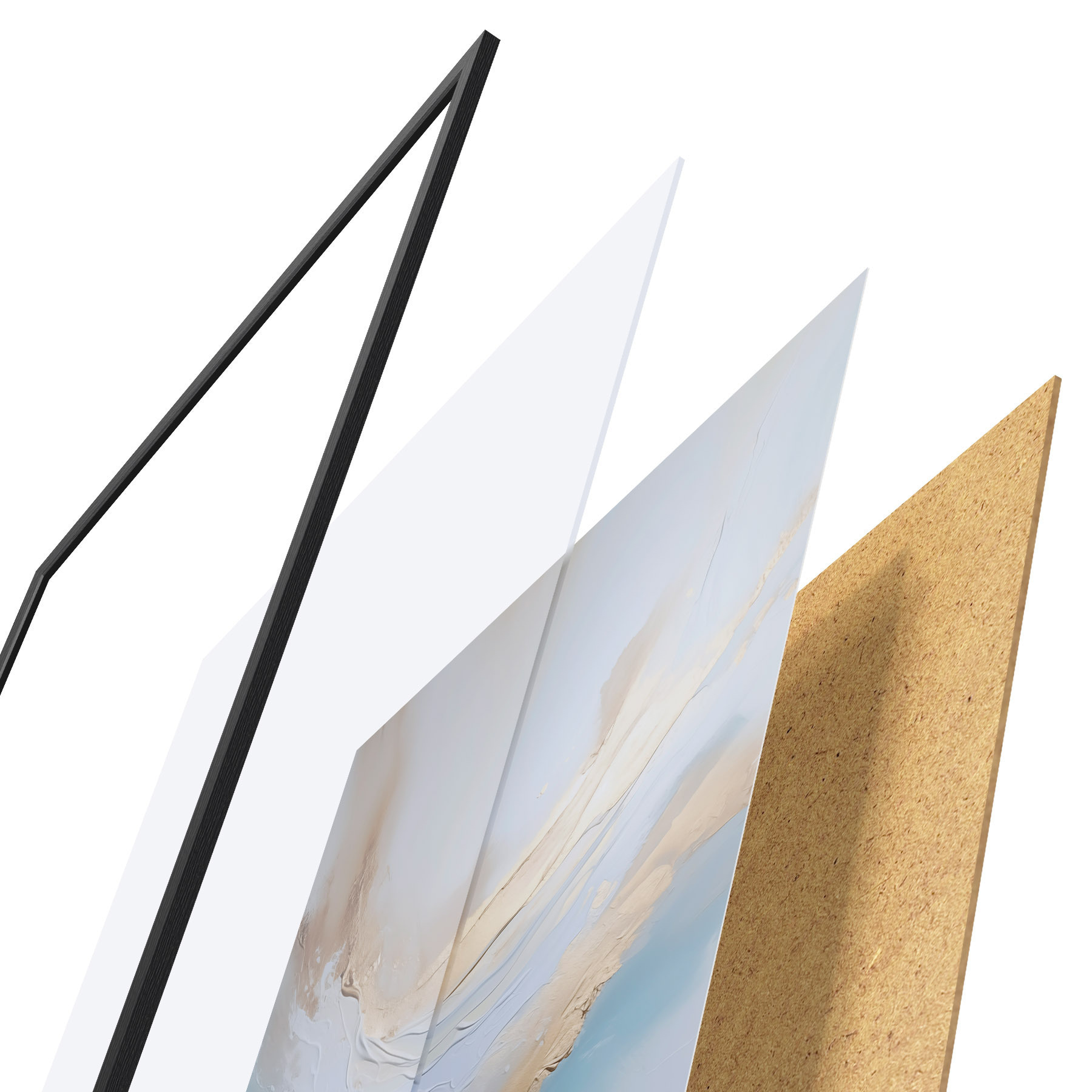 Plakat składa się z ramy, pleksi, wydrukowanego obrazu i podkładu z płyty wiórowej. Plakat można natychmiast zawiesić na ścianie dzięki uchwytom z tyłu.