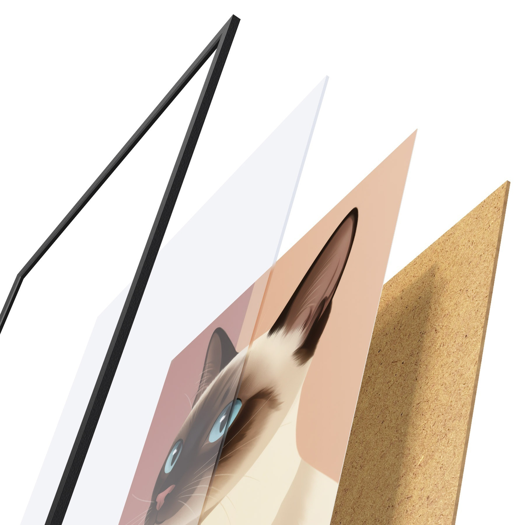 Plakat składa się z ramy, pleksi, wydrukowanego obrazu i podkładu z płyty wiórowej. Plakat można natychmiast zawiesić na ścianie dzięki uchwytom z tyłu.