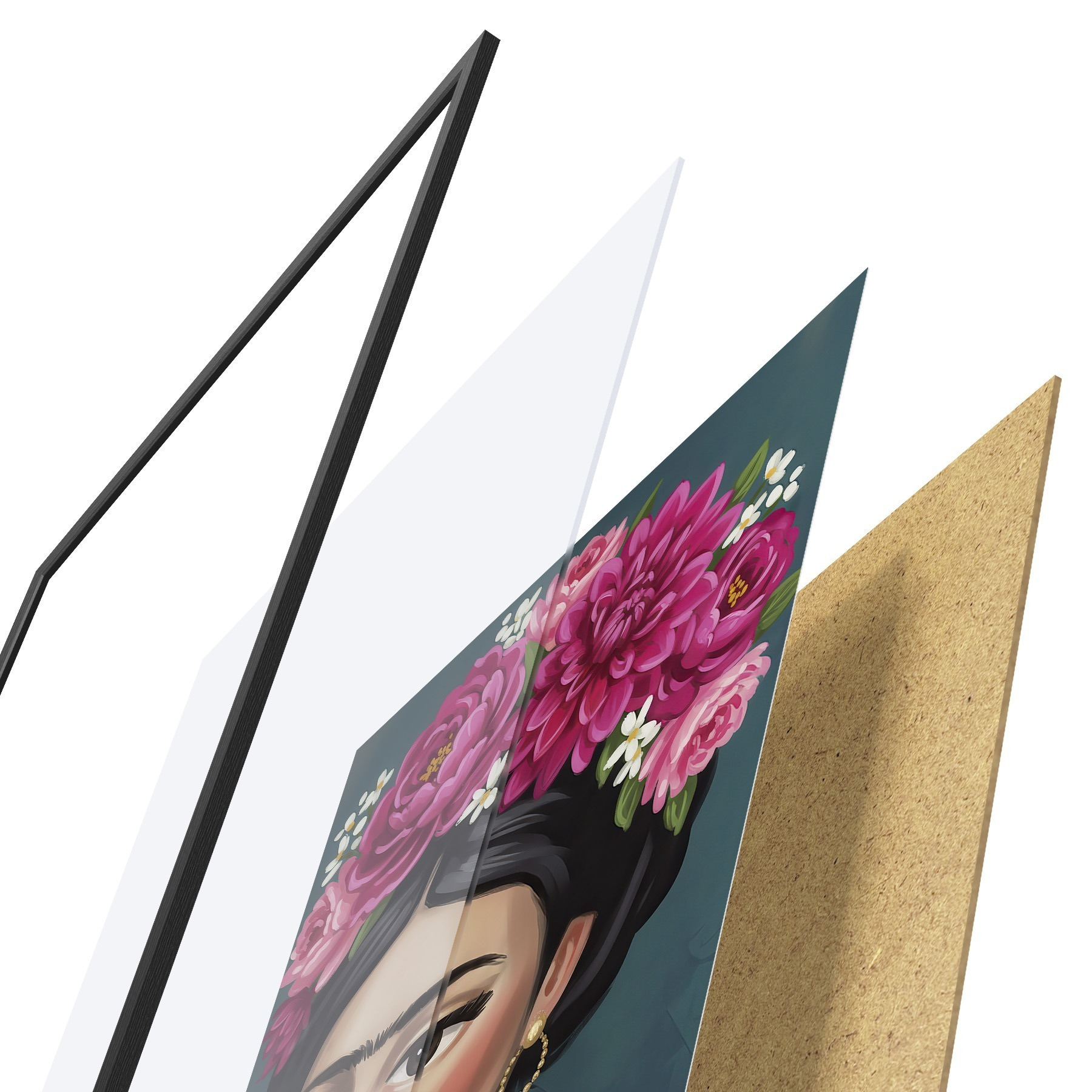 Plakat składa się z ramy, pleksi, wydrukowanego obrazu i podkładu z płyty wiórowej. Plakat można natychmiast zawiesić na ścianie dzięki uchwytom z tyłu.