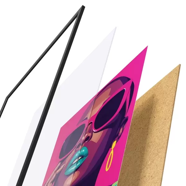 Plakat składa się z ramy, pleksi, wydrukowanego obrazu i podkładu z płyty wiórowej. Plakat można natychmiast zawiesić na ścianie dzięki uchwytom z tyłu.