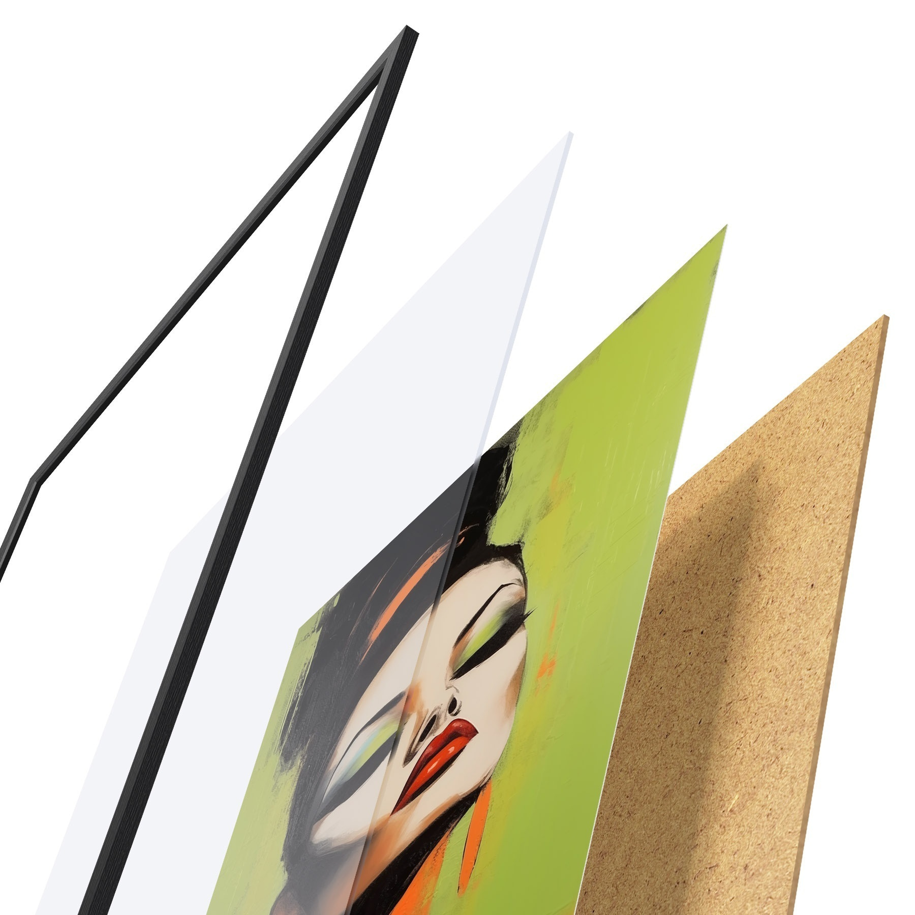 Plakat składa się z ramy, pleksi, wydrukowanego obrazu i podkładu z płyty wiórowej. Plakat można natychmiast zawiesić na ścianie dzięki uchwytom z tyłu.