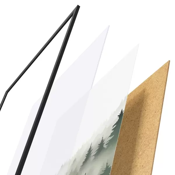 Plakat składa się z ramy, pleksi, wydrukowanego obrazu i podkładu z płyty wiórowej. Plakat można natychmiast zawiesić na ścianie dzięki uchwytom z tyłu.