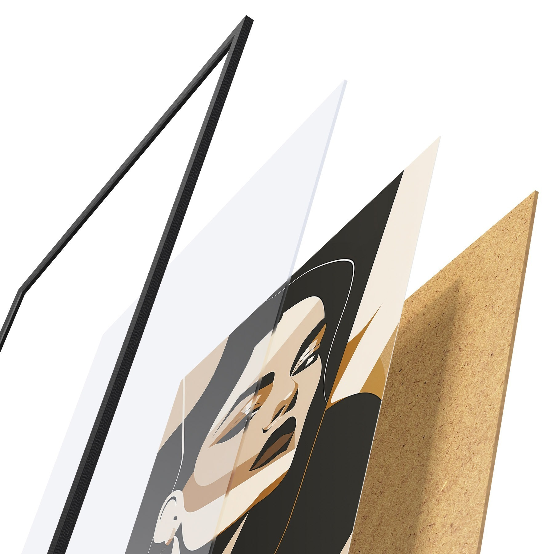 Plakat składa się z ramy, pleksi, wydrukowanego obrazu i podkładu z płyty wiórowej. Plakat można natychmiast zawiesić na ścianie dzięki uchwytom z tyłu.