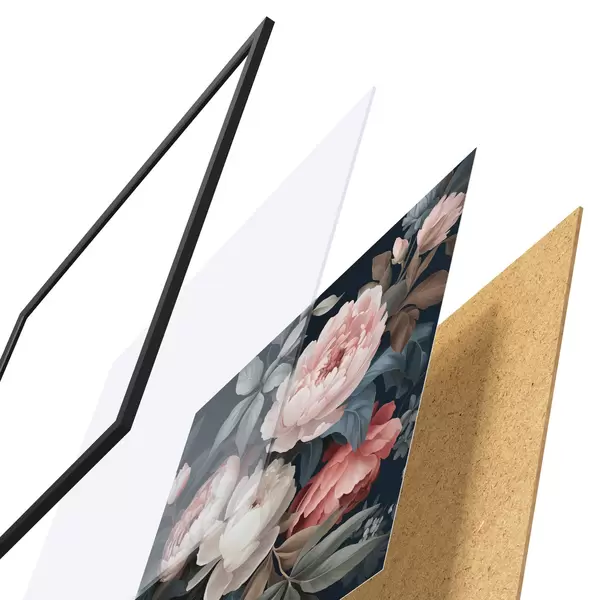 Plakat składa się z ramy, pleksi, wydrukowanego obrazu i podkładu z płyty wiórowej. Plakat można natychmiast zawiesić na ścianie dzięki uchwytom z tyłu.