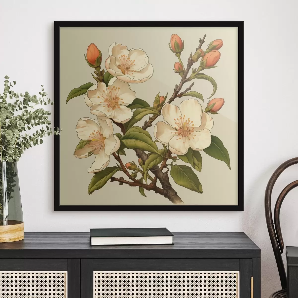 Plakat Kwitnąca gałąź z białymi kwiatami na beżowym tle w stylu klasycznej ilustracji f46923