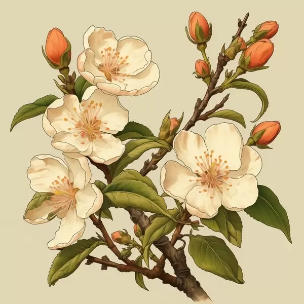 Poster Kwitnąca gałąź z białymi kwiatami na beżowym tle w stylu klasycznej ilustracji Nr f46923