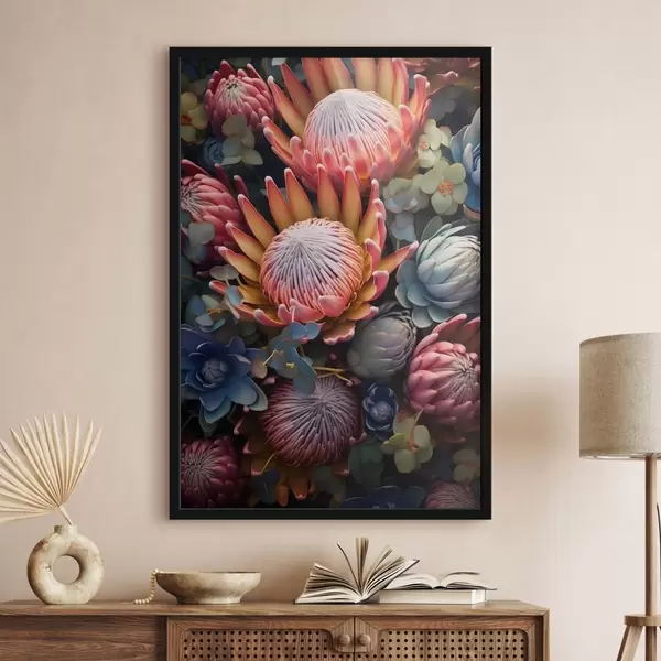 Plakat Kompozycja protei, eukaliptusa i sukulentów w fotorealistycznym stylu sztuki cyfrowej f46925