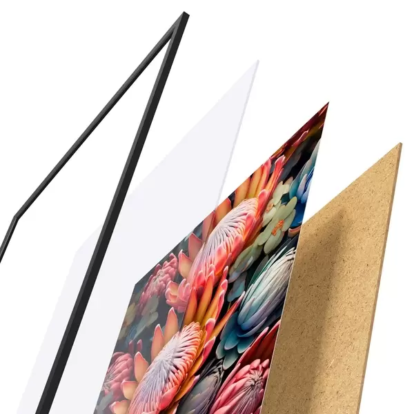 Plakat składa się z ramy, pleksi, wydrukowanego obrazu i podkładu z płyty wiórowej. Plakat można natychmiast zawiesić na ścianie dzięki uchwytom z tyłu.