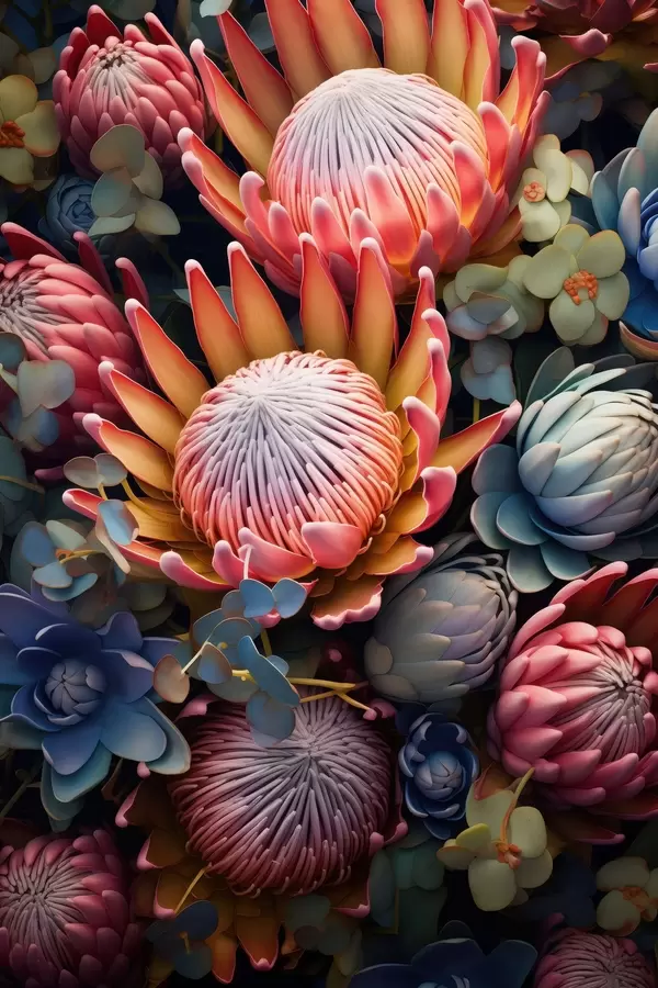 Poster Kompozycja protei, eukaliptusa i sukulentów w fotorealistycznym stylu sztuki cyfrowej Nr f46925
