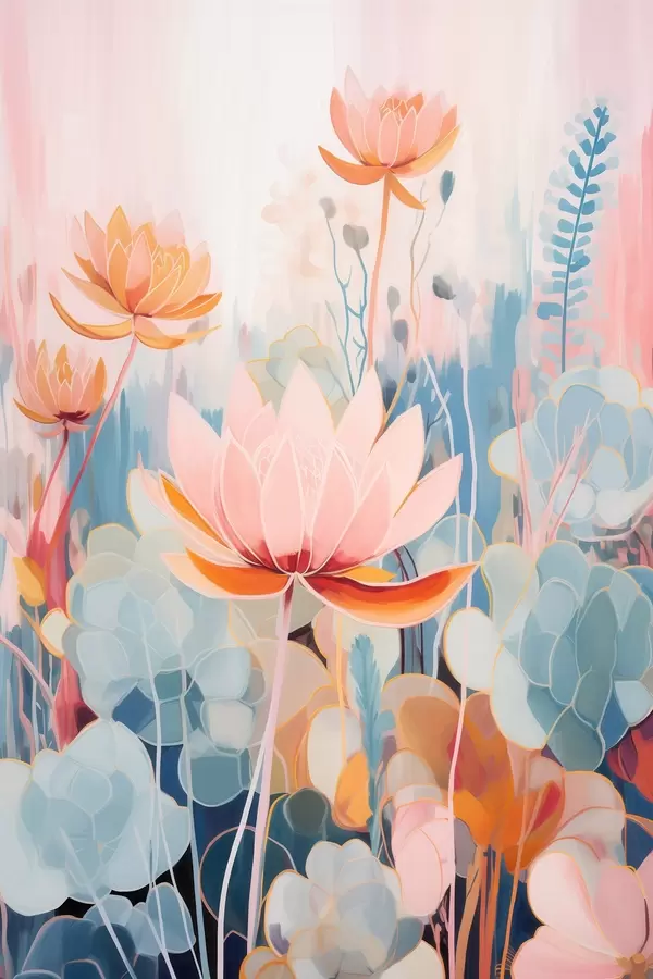 Plakat Lotosy i ozdobne liście w różowo-niebieskiej kolorystyce f46929