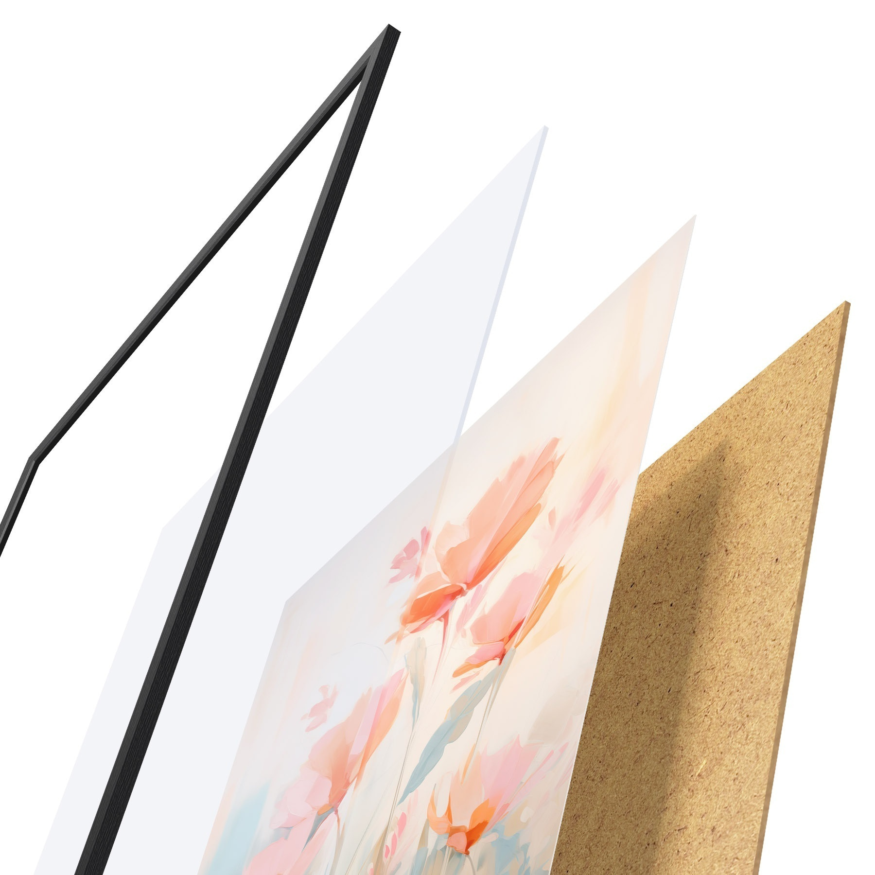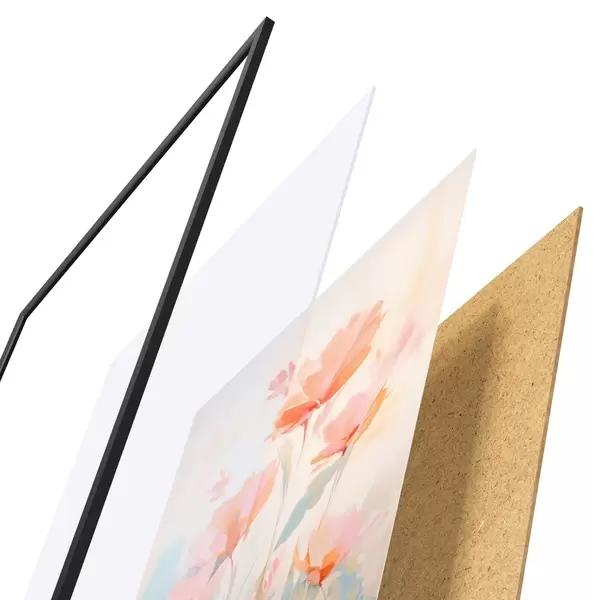 Plakat składa się z ramy, pleksi, wydrukowanego obrazu i podkładu z płyty wiórowej. Plakat można natychmiast zawiesić na ścianie dzięki uchwytom z tyłu.