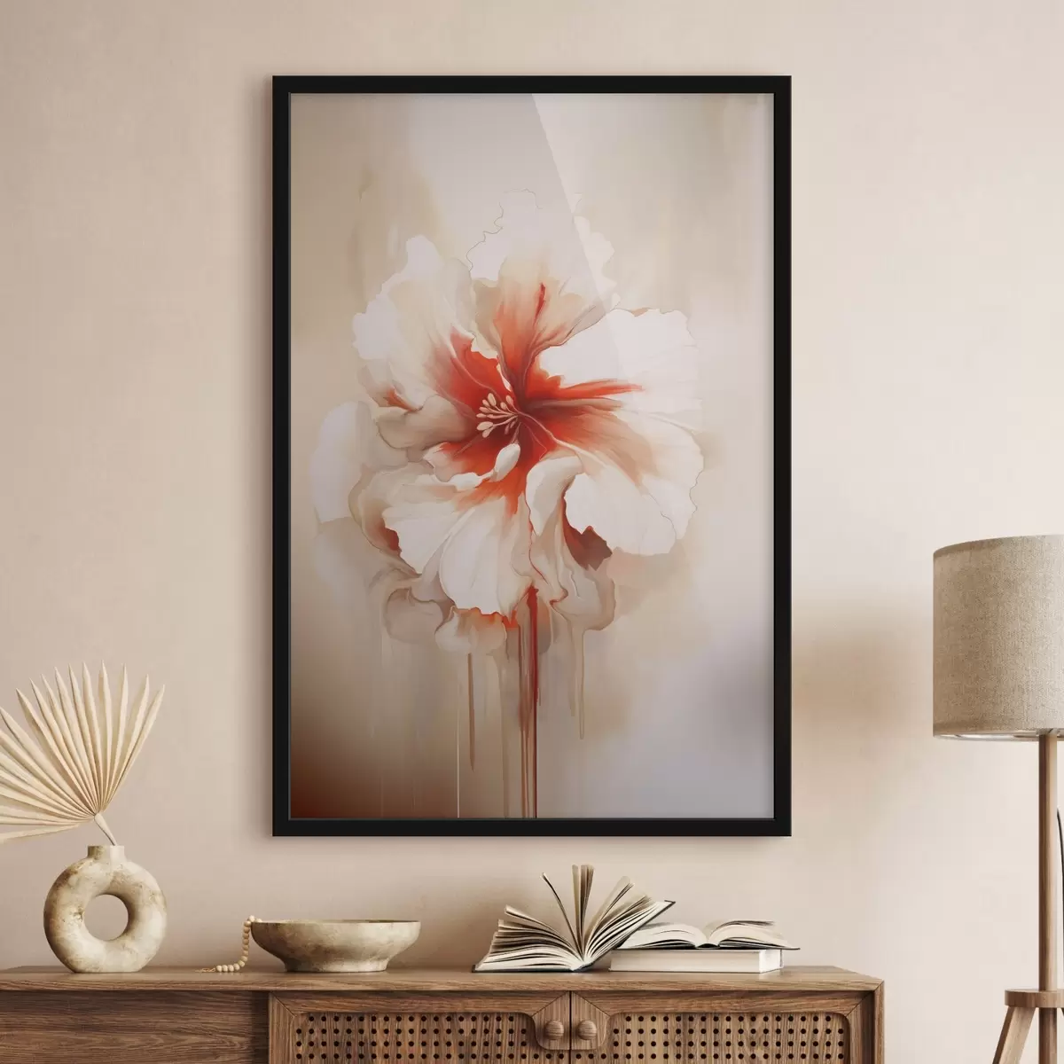 Plakat Biały i czerwony kwiat z półprzezroczystymi płatkami i płynącymi kroplami farby f46940