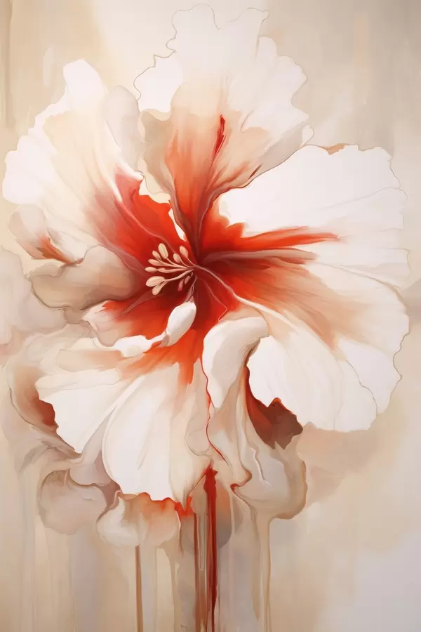Poster Zbliżenie na biało-czerwony kwiat z półprzezroczystymi płatkami i spływającymi kroplami farby Nr f46941