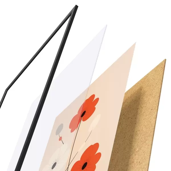 Plakat składa się z ramy, pleksi, wydrukowanego obrazu i podkładu z płyty wiórowej. Plakat można natychmiast zawiesić na ścianie dzięki uchwytom z tyłu.
