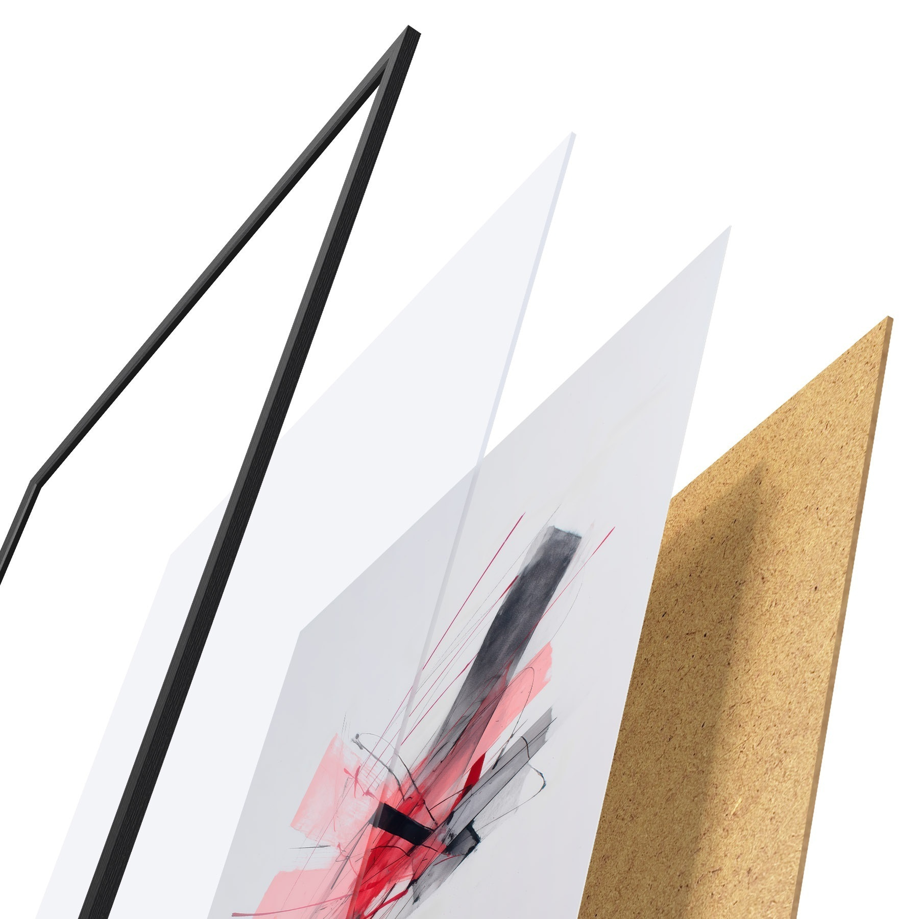 Plakat składa się z ramy, pleksi, wydrukowanego obrazu i podkładu z płyty wiórowej. Plakat można natychmiast zawiesić na ścianie dzięki uchwytom z tyłu.