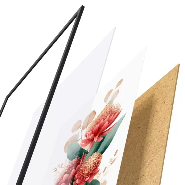 Plakat składa się z ramy, pleksi, wydrukowanego obrazu i podkładu z płyty wiórowej. Plakat można natychmiast zawiesić na ścianie dzięki uchwytom z tyłu.