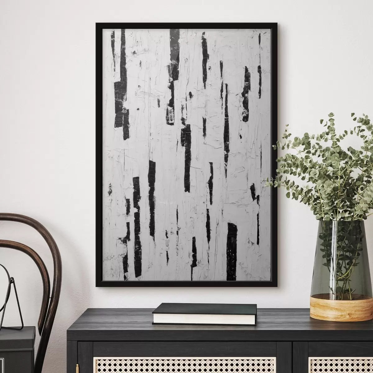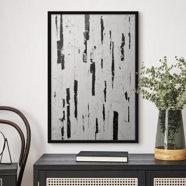 Plakat Abstrakcyjna kompozycja z czarnymi pionowymi pociągnięciami pędzla na białym tle w stylu malarstwa olejnego. f46956
