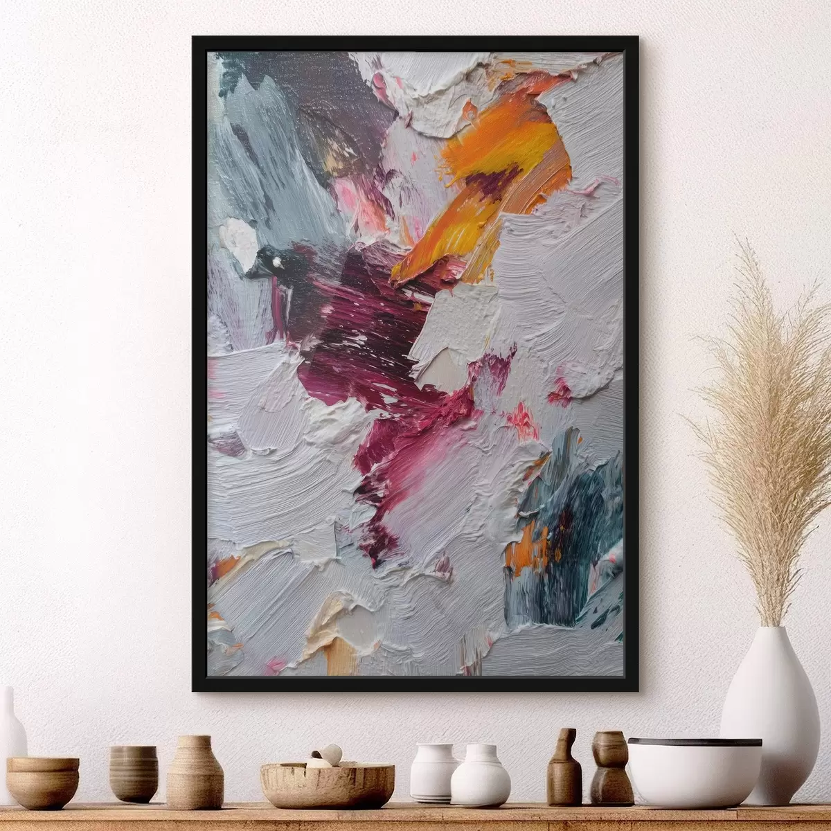 Plakat Abstrakcyjna kompozycja z intensywnymi pociągnięciami pędzla w kolorze wiśniowym i pomarańczowym w stylu malarstwa olejnego. f46959