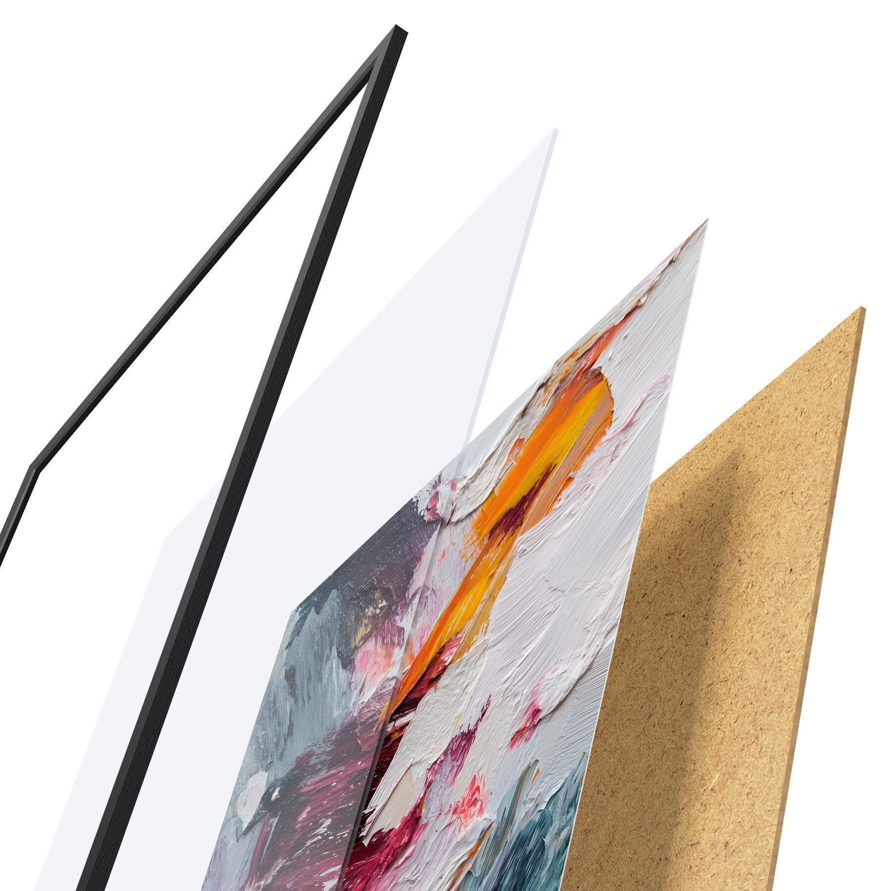 Plakat składa się z ramy, pleksi, wydrukowanego obrazu i podkładu z płyty wiórowej. Plakat można natychmiast zawiesić na ścianie dzięki uchwytom z tyłu.