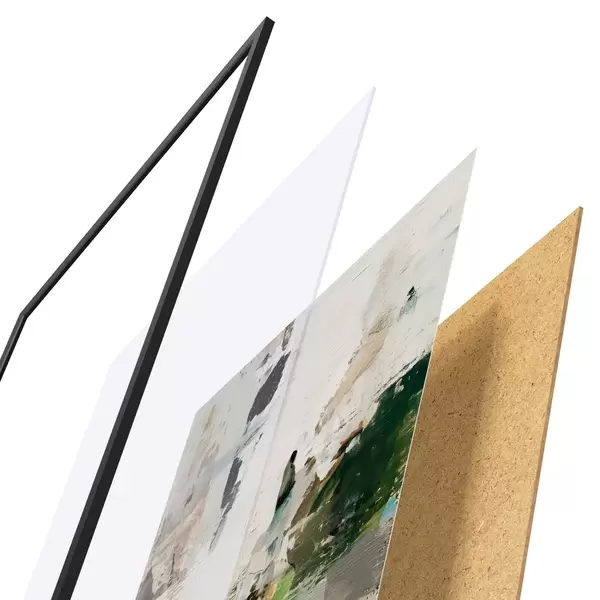 Plakat składa się z ramy, pleksi, wydrukowanego obrazu i podkładu z płyty wiórowej. Plakat można natychmiast zawiesić na ścianie dzięki uchwytom z tyłu.