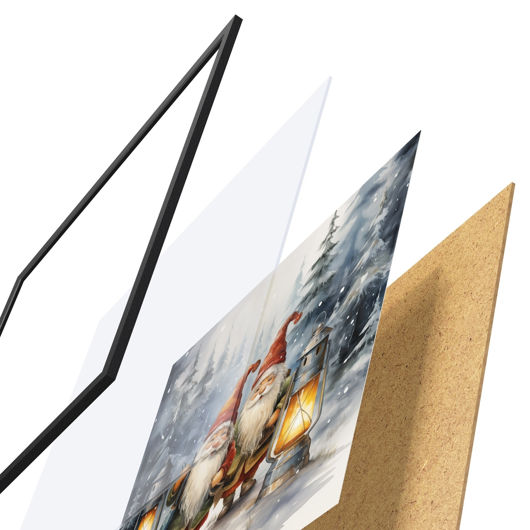 Plakat składa się z ramy, pleksi, wydrukowanego obrazu i podkładu z płyty wiórowej. Plakat można natychmiast zawiesić na ścianie dzięki uchwytom z tyłu.