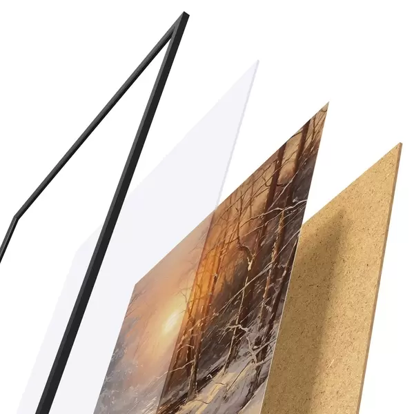 Plakat składa się z ramy, pleksi, wydrukowanego obrazu i podkładu z płyty wiórowej. Plakat można natychmiast zawiesić na ścianie dzięki uchwytom z tyłu.