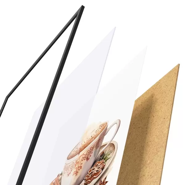 Plakat składa się z ramy, pleksi, wydrukowanego obrazu i podkładu z płyty wiórowej. Plakat można natychmiast zawiesić na ścianie dzięki uchwytom z tyłu.