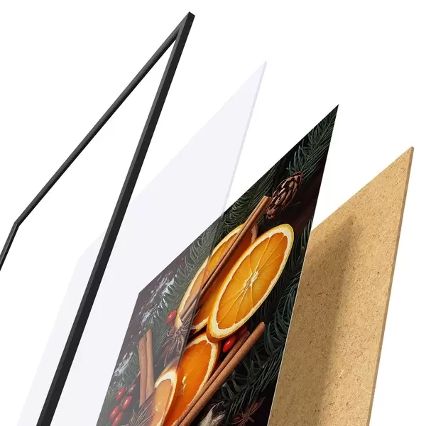 Plakat składa się z ramy, pleksi, wydrukowanego obrazu i podkładu z płyty wiórowej. Plakat można natychmiast zawiesić na ścianie dzięki uchwytom z tyłu.