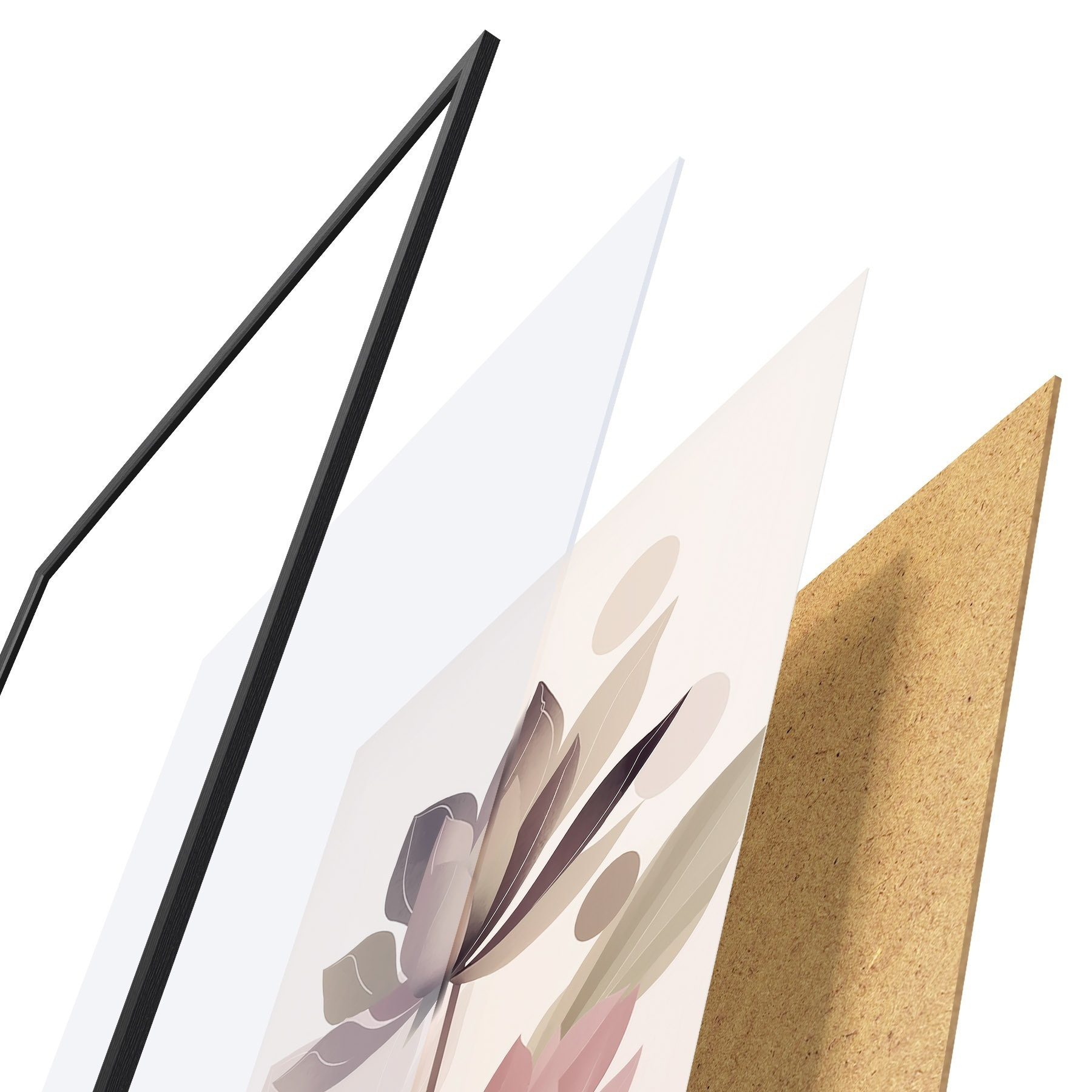 Plakat składa się z ramy, pleksi, wydrukowanego obrazu i podkładu z płyty wiórowej. Plakat można natychmiast zawiesić na ścianie dzięki uchwytom z tyłu.