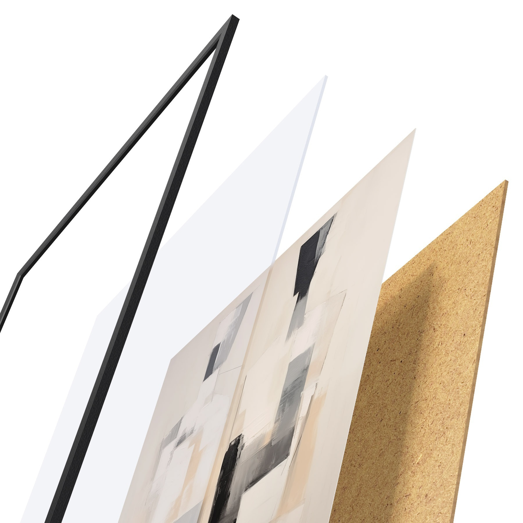 Plakat składa się z ramy, pleksi, wydrukowanego obrazu i podkładu z płyty wiórowej. Plakat można natychmiast zawiesić na ścianie dzięki uchwytom z tyłu.