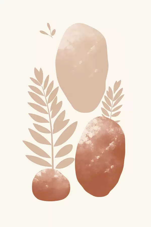Poster Abstrakcyjne kształty, kamienie o fakturze i liście w stonowanych odcieniach brzoskwini i terakoty, minimalistyczne, kremowe tło Nr f47012