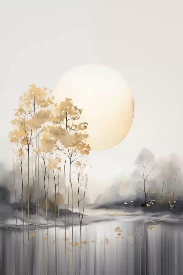 Poster Dekoracyjny abstrakcyjny krajobraz, wysokie drzewa z żółtymi liśćmi, rzeka i mgła w tle Nr f47014