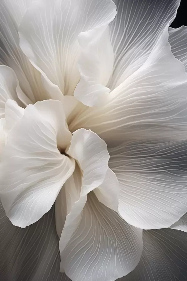 Plakat Zbliżenie na delikatne, abstrakcyjne białe płatki kwiatów o skomplikowanych liniach i zamazanym ciemnym tle f47018