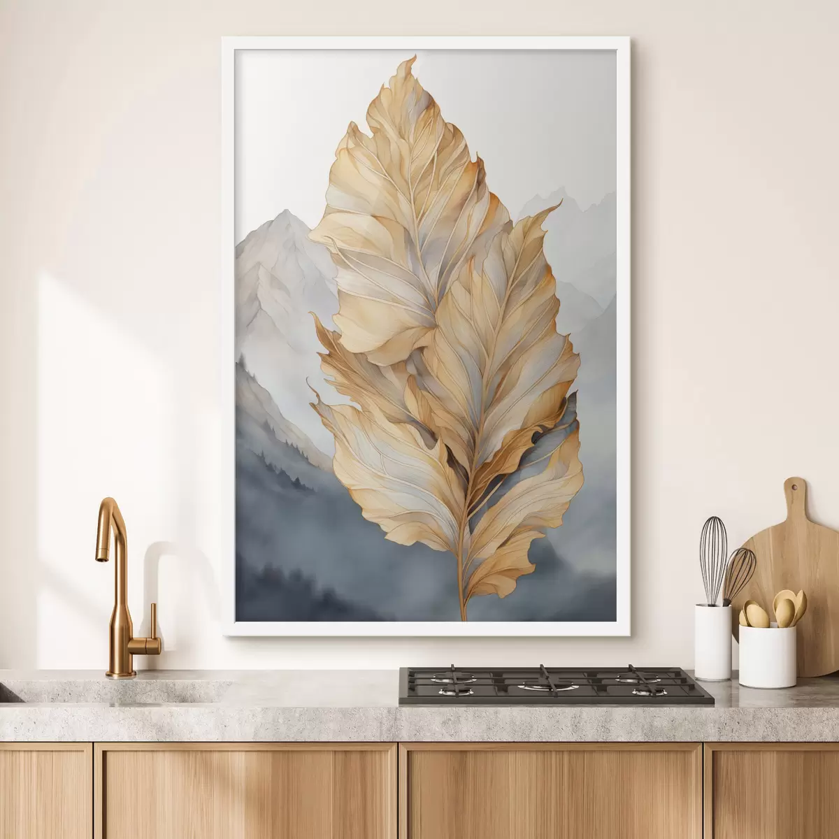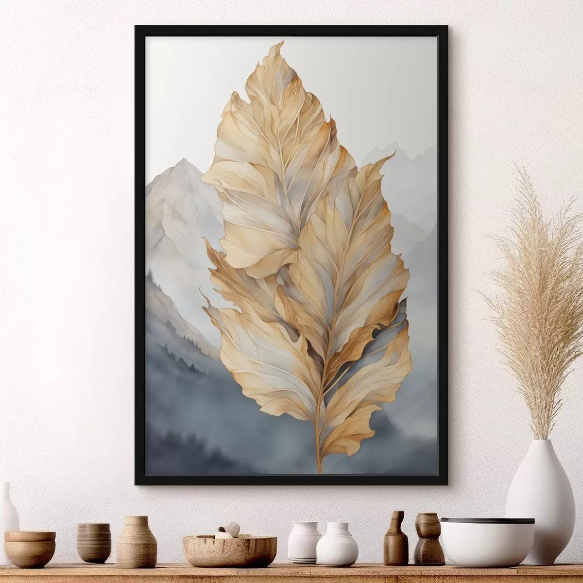 Plakat Abstrakcyjne, duże, żółte i brązowe liście o skomplikowanych szczegółach na tle górskiego krajobrazu. f47022