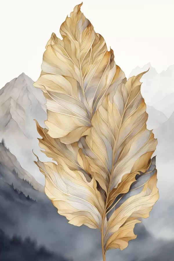Poster Abstrakcyjne, duże, żółte i brązowe liście o skomplikowanych szczegółach na tle górskiego krajobrazu Nr f47022