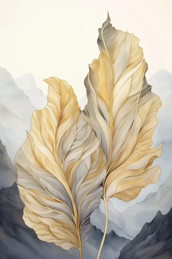 Plakat Abstrakcyjne, duże, żółte i brązowe liście o skomplikowanych szczegółach na tle górskiego krajobrazu f47023