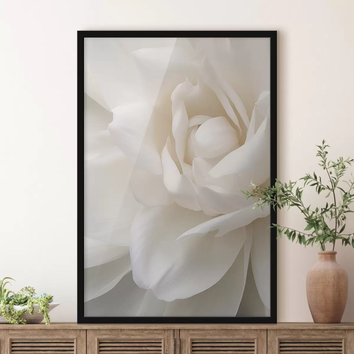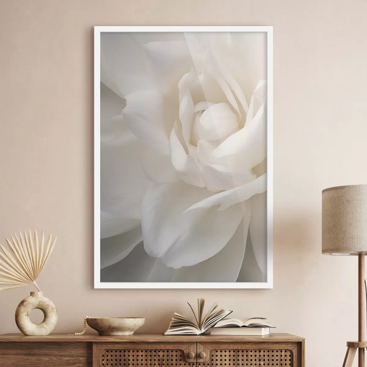 Plakat Abstrakcyjny biały kwiat z delikatnymi, warstwowymi płatkami, minimalistyczna sztuka f47025
