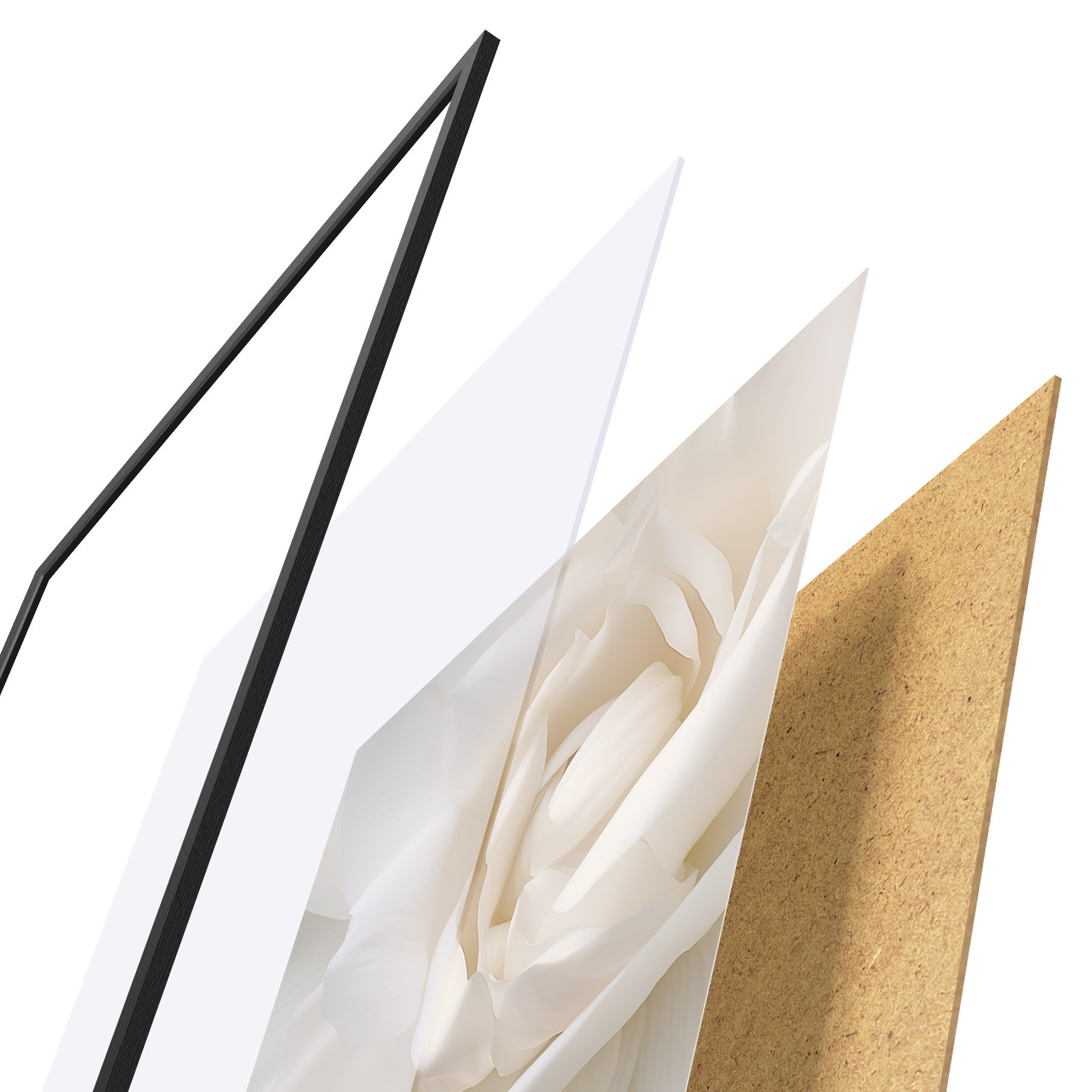 Plakat składa się z ramy, pleksi, wydrukowanego obrazu i podkładu z płyty wiórowej. Plakat można natychmiast zawiesić na ścianie dzięki uchwytom z tyłu.