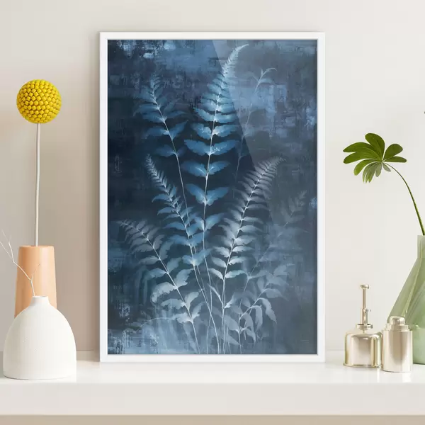 Plakat Niebieskie paprocie i rośliny na ciemnym, teksturowanym tle, z naciskiem na skomplikowane detale, efekt rentgenowski. f47027