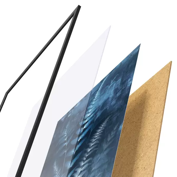 Plakat składa się z ramy, pleksi, wydrukowanego obrazu i podkładu z płyty wiórowej. Plakat można natychmiast zawiesić na ścianie dzięki uchwytom z tyłu.