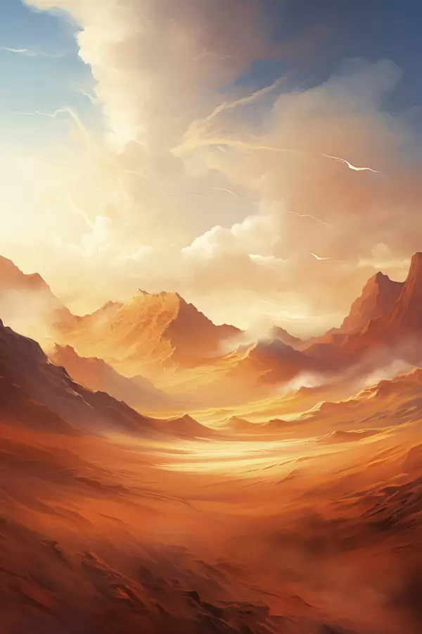 Plakat Rozległy, pomarańczowy krajobraz pustynny z wysokimi, skalistymi górami pod zamglonym, nasłonecznionym niebem z rzadkimi chmurami f47028