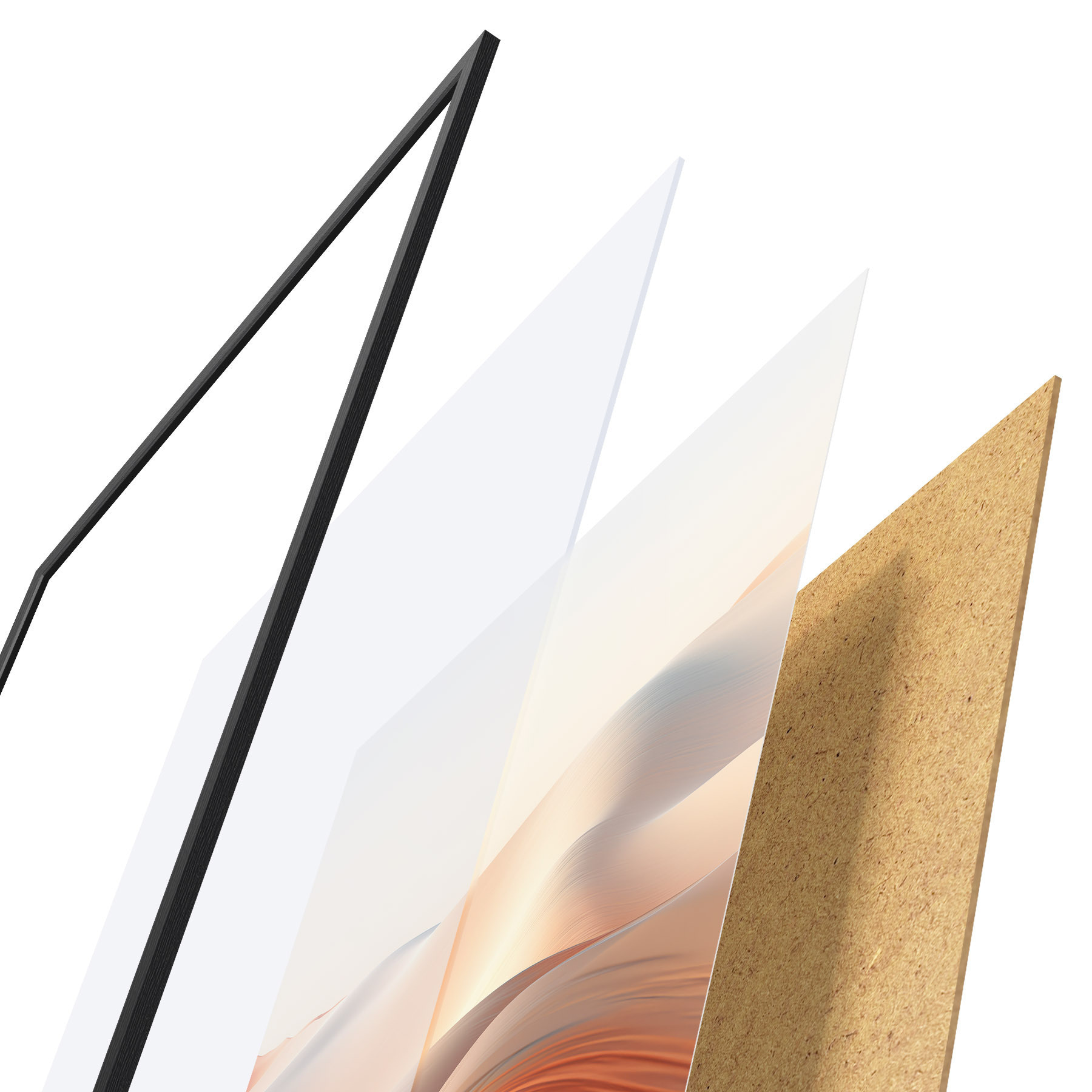 Plakat składa się z ramy, pleksi, wydrukowanego obrazu i podkładu z płyty wiórowej. Plakat można natychmiast zawiesić na ścianie dzięki uchwytom z tyłu.