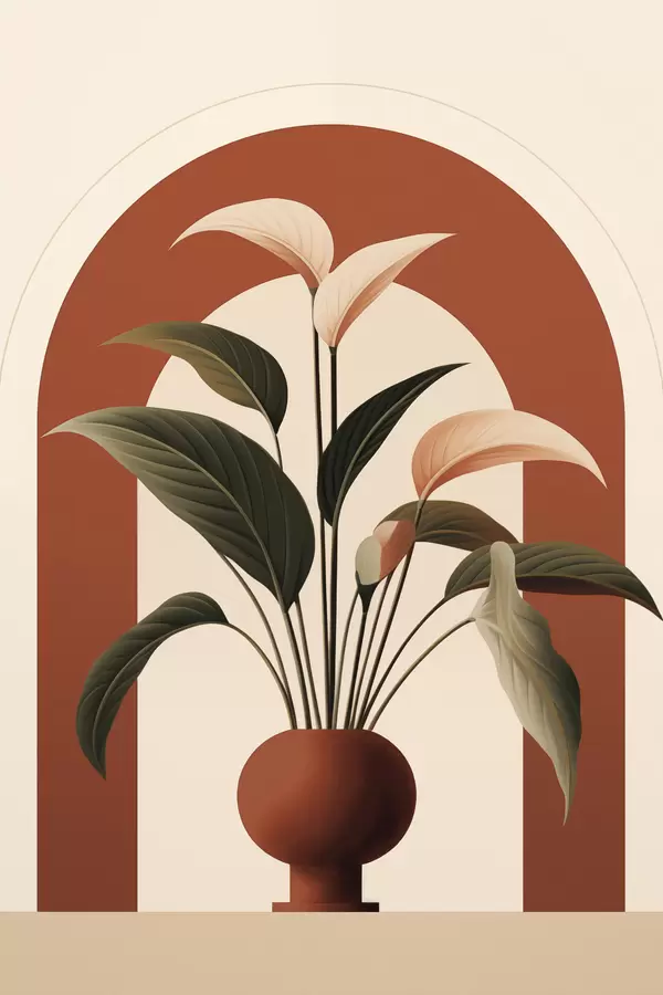 Poster Abstrakcyjna roślina doniczkowa z dużymi zielonymi i beżowymi liśćmi przed kremową bramą z akcentami terakoty Nr f47032