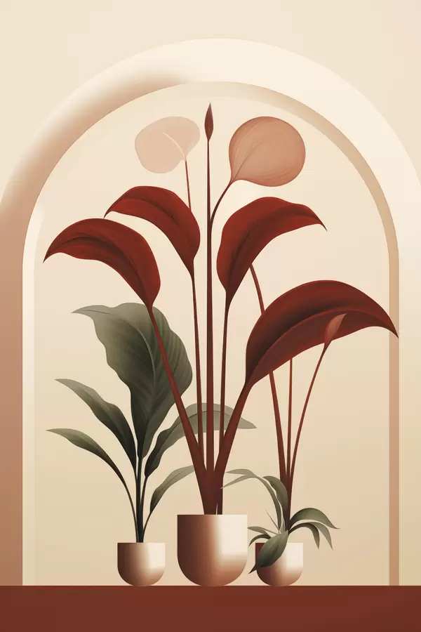 Plakat Abstrakcyjne rośliny doniczkowe z dużymi zielonymi i czerwonymi liśćmi przed kremową bramą łukową f47033