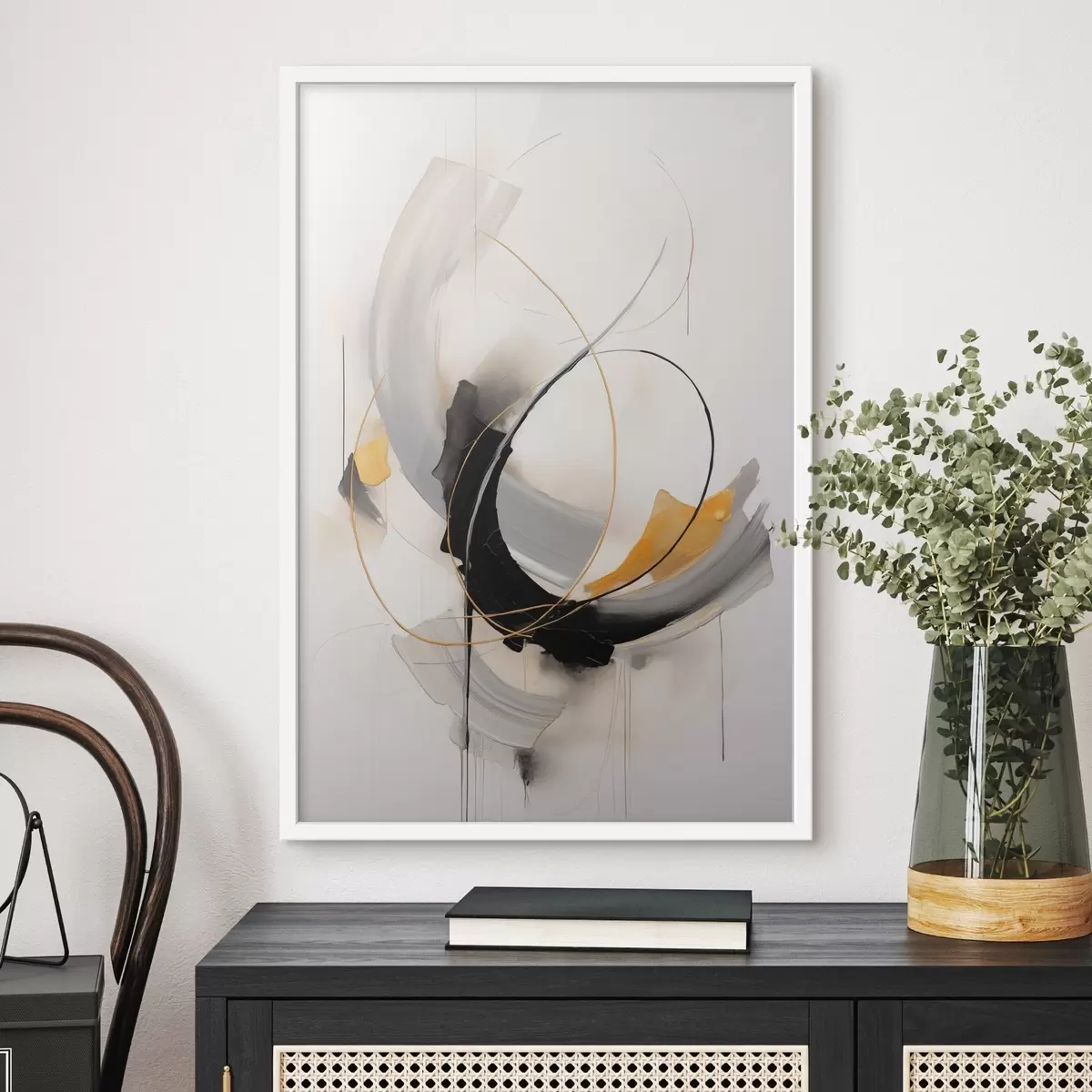 Plakat Obraz abstrakcyjny z imitacją żółtych, czarnych i białych pociągnięć pędzla, dynamiczne linie f47035