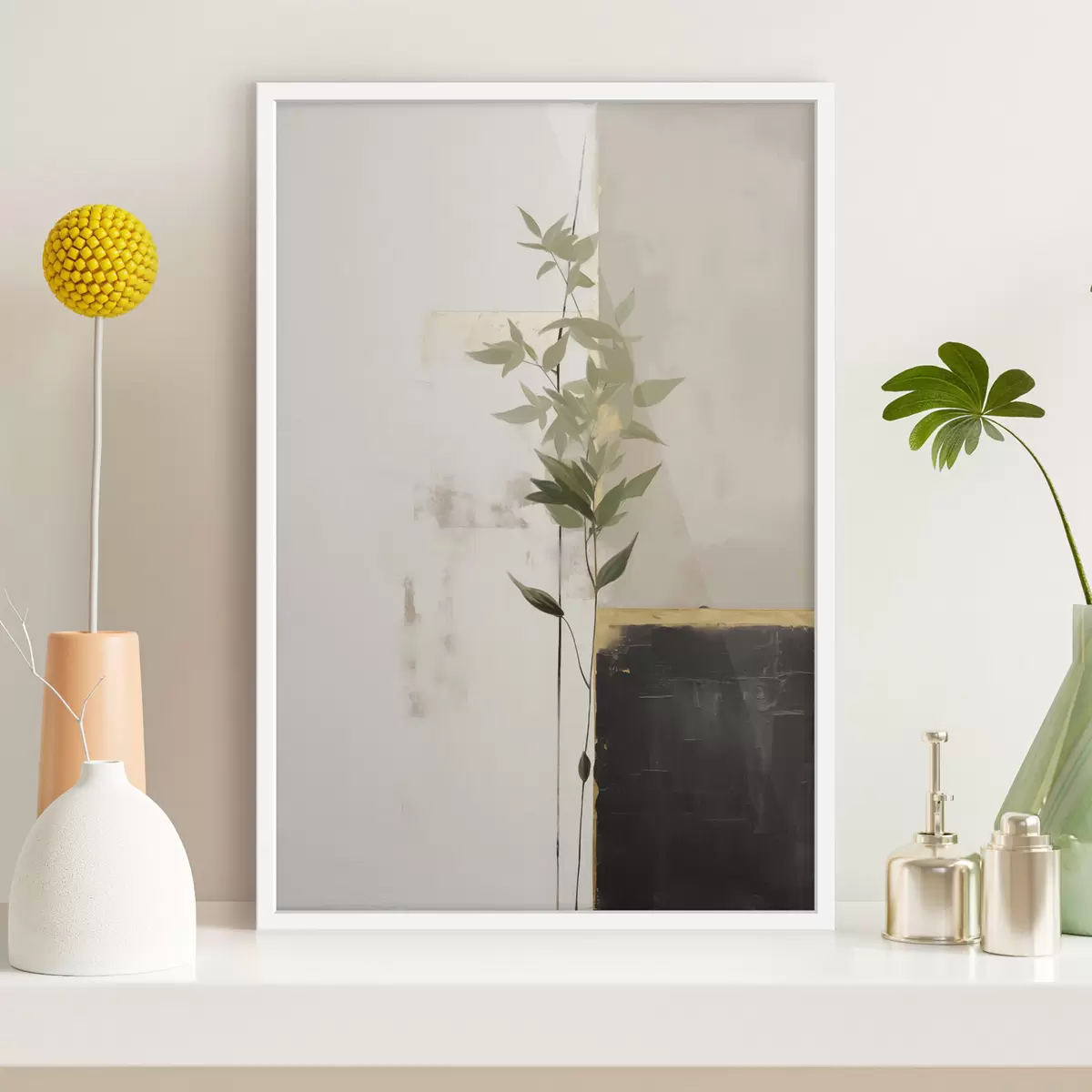 Poster Minimalistyczny obraz przedstawiający wazon z zielonymi liśćmi na tle abstrakcyjnych geometrycznych kształtów. Nr f47037