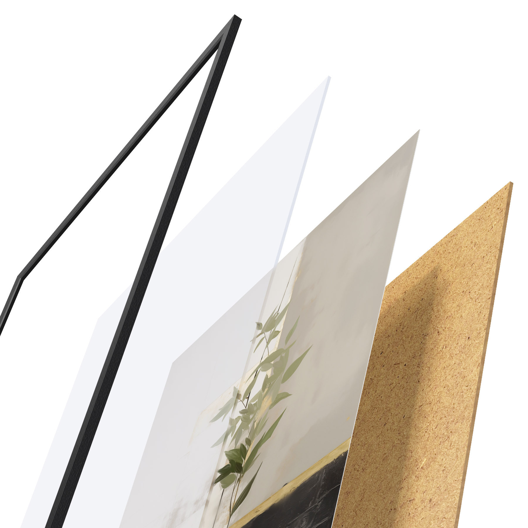 Plakat składa się z ramy, pleksi, wydrukowanego obrazu i podkładu z płyty wiórowej. Plakat można natychmiast zawiesić na ścianie dzięki uchwytom z tyłu.